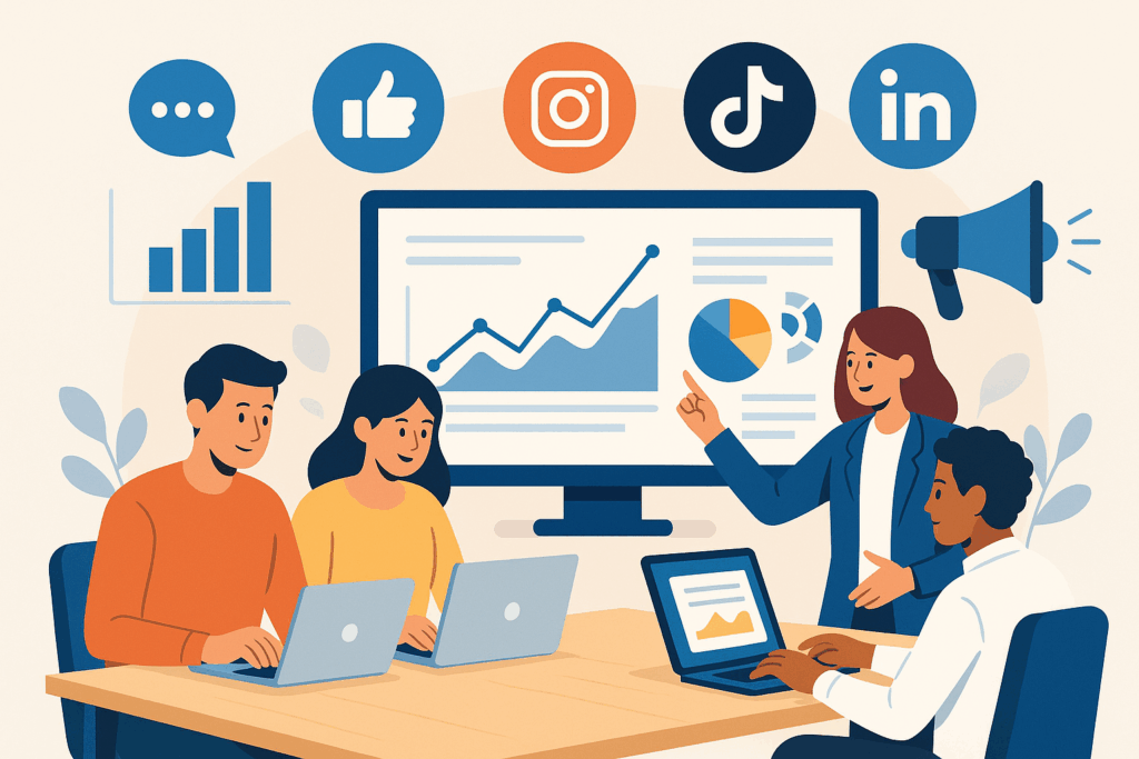 Prowadzimy profesjonalne profile firmowe na Facebooku, Instagramie, TikToku i LinkedIn. Tworzymy angażujące treści, dbamy o spójny wizerunek marki oraz regularną komunikację z odbiorcami. Dzięki temu Twoja firma zyskuje lojalnych klientów i większy zasięg w mediach społecznościowych.